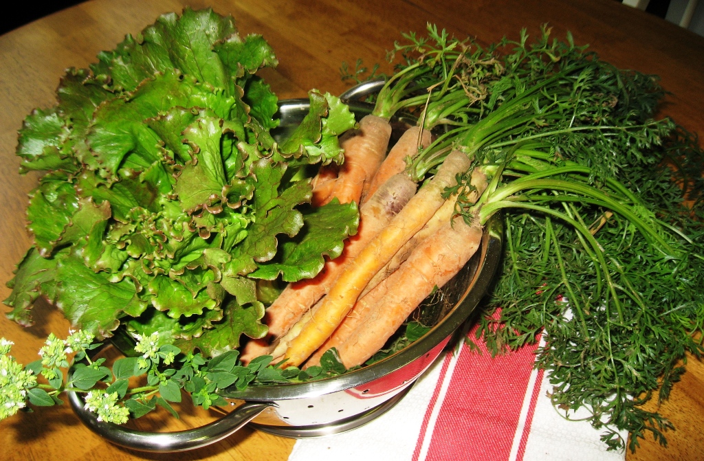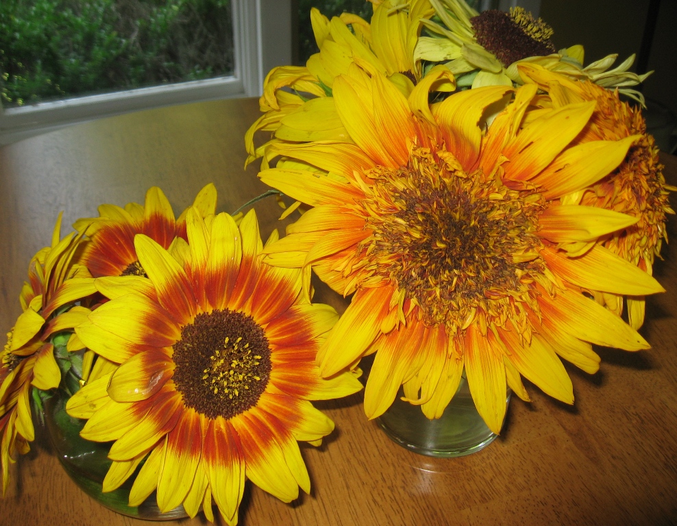 Saw one of our neighbors, Mary Lee, at the Farmers Market last weekend and she told us how the storm came through and knocked over many of the sunflowers in her garden. She invited us to come by her farm later that afternoon to get some flowers before they died. So we grabbed a bag of cucumbers and headed over there for a trade. Before we left, she had given us a variety of gorgeous sunflowers, hundreds of sunflower seeds to plant our own garden, plus lettuce and fresh carrots for that night’s dinner salad. Now that’s a good neighbor!