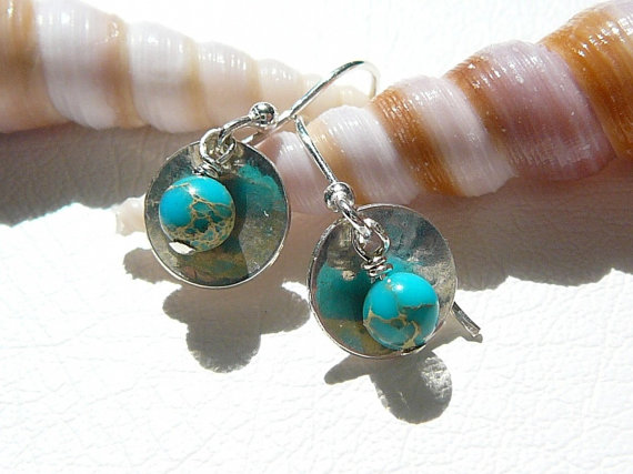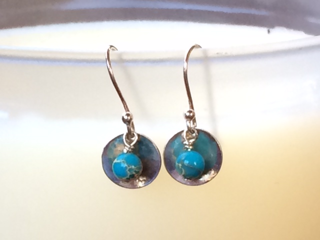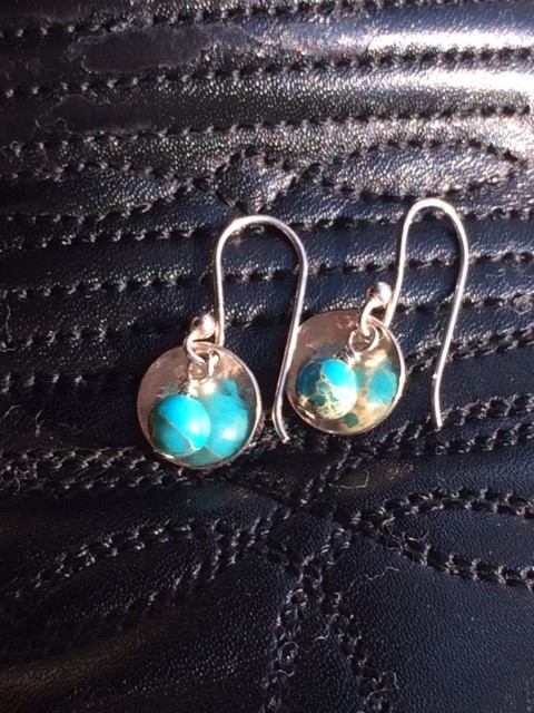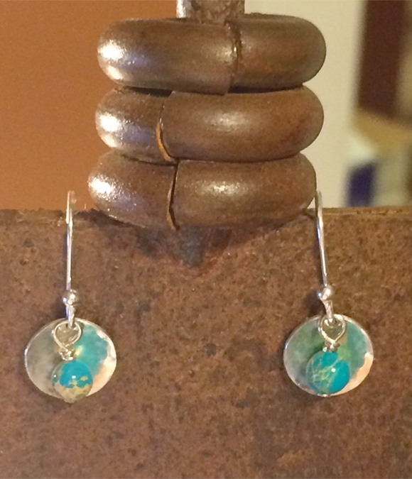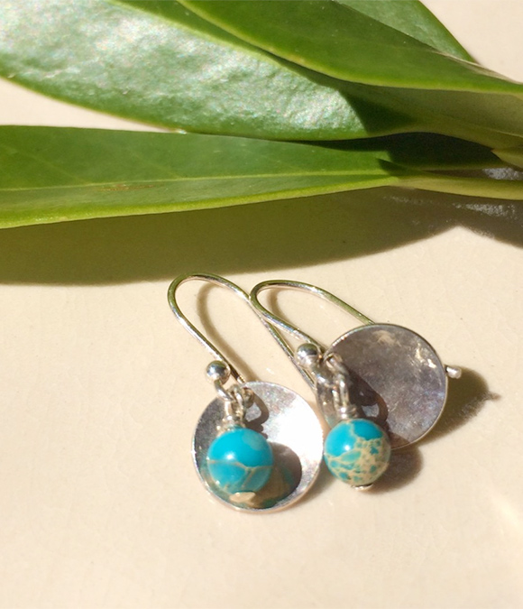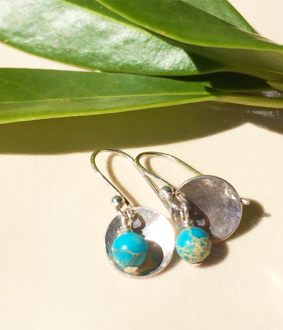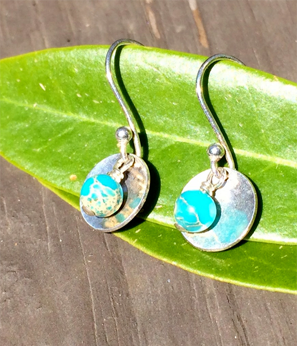 These one-of-a-kind beauties start with hand-hammered 9mm sterling silver discs, fronted by turquoise jasper bead dangles and then finished with beaded sterling silver ear wires. The earrings flutter just ever so when you wear them, giving off slight sparkle and color. Designer Susan McFall, who owns Crosses and Hearts, is an artist living in Orlando, Fla. and we bonded over a mutual love of Great Danes. With a degree in art, she focuses on jewelry, painting and mixed media, and her most favorite influences come from the beach, a casual lifestyle and working with rustic materials. Maybe you’ve seen Susan’s creations before, as many have been featured in films, TV shows and commercials. With just a touch of Western flair, this dainty jewelry would be a nice touch to your own Boho country style.