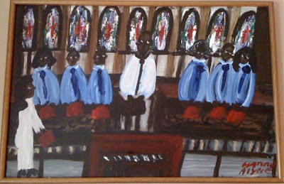 So…if you remember a previous post about folk artist Alyne Harris, http://tiny.cc/MGVmh, you may recall I’m coveting an old painting of hers–a church choir scene. It was nabbed by my sister, Dolly, years ago at Modern Primitive before we could get our hands on it. Well, now big sis is saying she might give it to us…one day…for the farm. I offered to pay, but I think she’s stringing me along. This past weekend, she even texted this photo…probably just a tease. C’mon, Doll, you know that painting belongs in rural Alabama, not Rhode Island. Name your price.